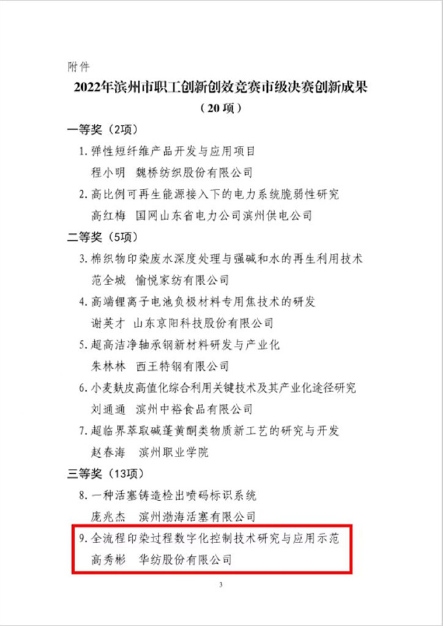 近日,濱州市總工會下發(fā)了《關(guān)于公布2022年濱州市職工創(chuàng)新創(chuàng)效競賽市級決賽創(chuàng)新成果名單的通知》。公司由信息互聯(lián)部軟件開發(fā)組主管高秀彬組織開發(fā)的“全流程印染過程數(shù)字化控制技術(shù)研究與應用示范”項目榮獲三等獎。