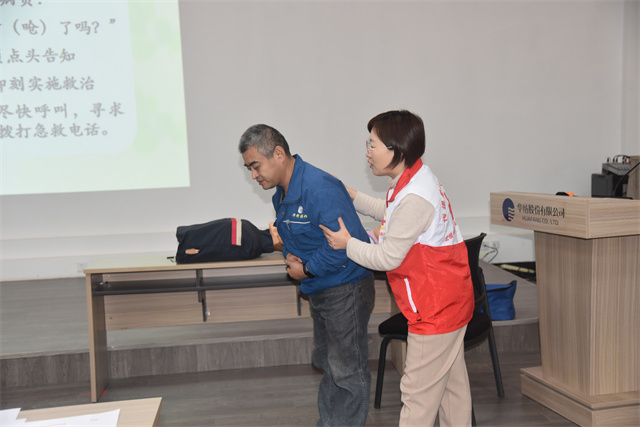 培訓課上,王燕老師首先介紹了紅十字運動的基本知識,隨后重點針對日常生活中較為常見的意外事故,向在場員工詳細講解,并演示了創(chuàng)傷救護、氣道異物梗阻急救、海姆立克急救法、心肺復蘇及包扎固定等急救技能和相關(guān)知識。