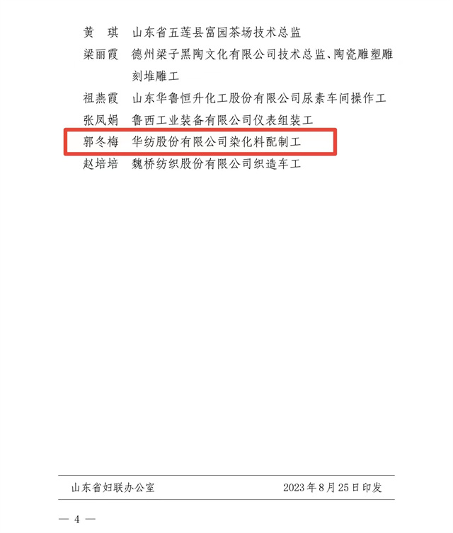 導(dǎo)讀:近日,山東省婦女聯(lián)合會、山東省總工會發(fā)布了“關(guān)于公布2023年度‘齊魯巾幗工匠’的通知”,公司染化料配制工郭冬梅名列其中。