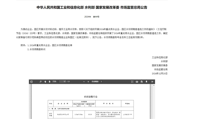 導(dǎo)讀:日前,國家工信部、水利部、發(fā)展改革委、市場監(jiān)管總局等四部門聯(lián)合公示了“2024年重點(diǎn)用水企業(yè)、園區(qū)水效領(lǐng)跑者名單”,公司成功入選國家級重點(diǎn)企業(yè)水效領(lǐng)跑者