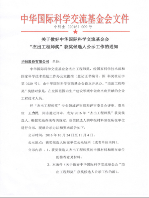 經(jīng)“杰出工程師獎”專業(yè)領(lǐng)域評審組和評審委員會評審,華紡股份有限公司王力民同志通過評審,成為2016年“杰出工程師獎”獲獎候選人。根據(jù)獎勵辦法有關(guān)規(guī)定,獲獎候選人的申報材料需所在單位進(jìn)行公示。公示如下: