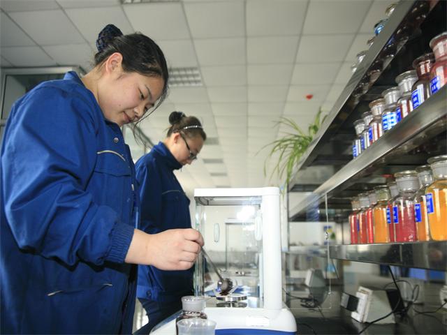 圖為公司花二車間技術(shù)人員在進行顏色配比。